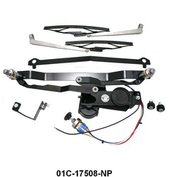 | Note | Complete 12 volt wiper system. Includes 2 speed wiper motor with switch, wiper transmission, linkage arms, mounting bracket, and stainless steel wiper arms and blades. Uses the stock wiper holes, which you enlarge to 5/8". Instructions included. |